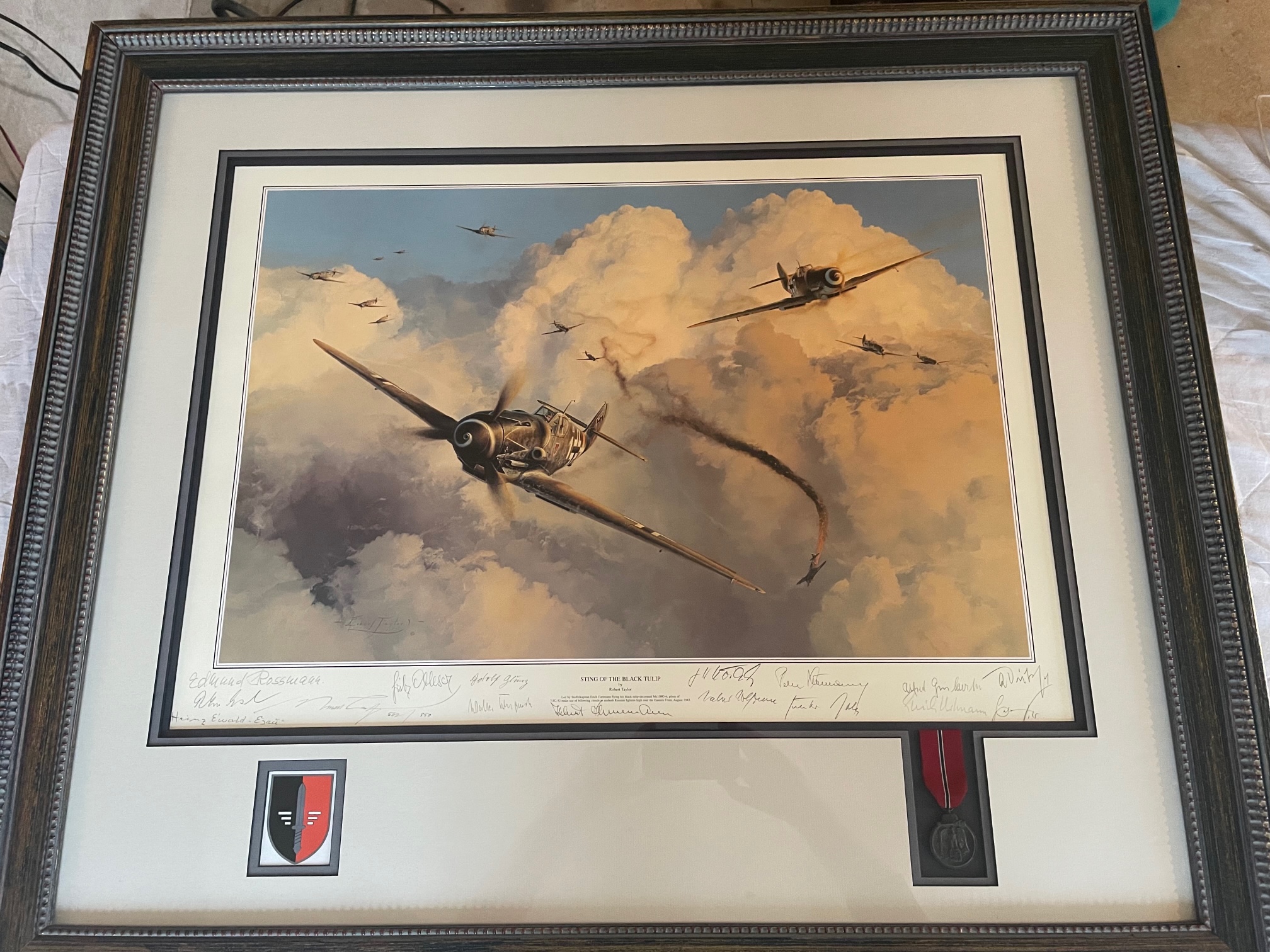 A much sought after Robert Taylor limited edition signed by the greatest fighter Ace of all time, Colonel Erich Hartmann. Legend has it that Russian pilots knew the Me109 with the Black Tulip painted on the nose was that of a great Luftwaffe air Ace, and a warning would be radioed to other pilots the moment the distinctive aircraft was sighted. The best chance of survival was to depart the scene quickly and without contest. Realising that his conspicuous insignia was the reason for a slight lull in his air victories, the great Ace had the flamboyant paintwork removed; immediately his phenomenal scoring rate resumed. True or false, one thing is beyond all doubt: the young fighter Ace, known to Russian pilots as The Black Tulip, would go on to become the highest-scoring fighter Ace in history, creating a record that will almost certainly stand forever in the annals of aerial warfare. Today that man is a legend among fighter pilots. His name is Erich Hartmann...STING OF THE BLACK TULIP commemorates Erich Hartmann's seven air victories in a day on 7th August, 1943. Depicted flying his Messerschmitt Me109 G-6, the maestro nails the first of these victories, as he and other pilots of JG-52 come hurtling into the attack. Making use of billowing cumulus clouds, the wily Staffelkapitan leads his squadron in a classic ambush sequence high over the Eastern Front. A consummate aerial combat painting by the great master of aviation art, Robert Taylor's dramatic scenario captures all the essence of aerial combat, as twelve Me 109s, guns blazing, come rushing headlong into battle. Already the first of the enemy has fallen to the guns of the squadron commander, and before the fight is over six more will have fallen victim to the Ace of fighter Aces...Individually hand signed by the artist : Robert Taylor and Erich Hartmann Knights Cross , Oakleaves , Swords and Diamonds , The Highest Scoring Ace in History with 352 confirmed Air Victories plus an amazing 14 additional Knights Cross Holder JG 52 Aces , Adolf Dickfeld , Peter Duttmann , Walter Krupinski , Gunther Rall , Kurt Schade , Walter Wolfrum , Alfred Grislawski , Edmund ' Paule ' Rossmann , Helmut Bennemann , Heinz ' Esau ' Ewald , Adolf Glunz , Viktor Petermann , Rudolf Trenkel and Franz Woidich all of JG 52...Some of these signatures are extremely rare and all of these veterans have since passed away , their signatures are now impossible to obtain...priced @ £2895.00.