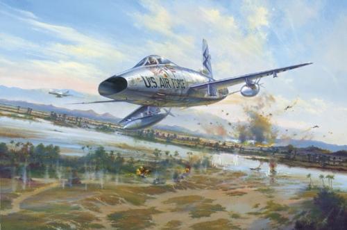 Successor to the brilliant F-86 Sabre, the North American F -100 Super Sabre was America's first truly supersonic jet fighter, and to this day one of the most aesthetically pleasing combat jet aircraft ever to fly. The F-100 first saw action during the Laos crisis of 1962-4 - a foretaste of things to come in neighbouring Vietnam. Following the Gulf of Tonkin incident in 1964, with US bombing North Vietnam for the first time, the American government ordered Operation Rolling Thunder - the sustained bombing campaign commenced in 1965 against Hanoi and other strategic targets in the north. By then, though ageing in design, the F-100 equipped no fewer than 16 USAF combat wings, and was employed in Vietnam primarily in ground attack and close air support roles. The F-100's air-to- ground sorties came to epitomise the war fought deep into South Vietnam, its pilots clocking up more combat missions than the P-51D pilots flew in World War II, this veritable jet flying combat from the first day of the conflict to the last...Simon Atack's spectacular painting brings this outstanding jet aircraft to life in a dramatic recreation of an event that took place on 14 May, 1965. Flying ground attack F-100D Super Sabres, the 'Silver Knights' - the 416th Squadron of the 31st Tactical Fighter Wing based at Da Nang - execute an attack on communist NVA guerrilla forces in the Bac Lieu region of South Vietnam. Having dropped their deadly cocktail of napalm and phosphor mixed with high explosive bombs right on enemy positions across the river, the F100s continue to spray 20mm cannon fire at river craft and ground troops over a 1,000ft swathe ahead of them as they exit the area. In the foreground Captain Don Kilgus is at full power, behind him the 'Silver Knights' F-1OOs follow at just under the speed of sound. At low-level Kilgus will hurtle along the dry creek out of the target area, before pulling the big jet into a mind-numbing high-G climb to clear the hazardous rising ground before heading home. A superb action painting from an era that saw some of the fiercest and most dangerous flying in the history of air combat... Signed by the artist : Simon Atack and George E 'Bud' May...priced @ £75.00 ...To complement the purchase of your fine art print, we are now able to offer a professional Picture Framing service. For further details please contact us by phone or email.