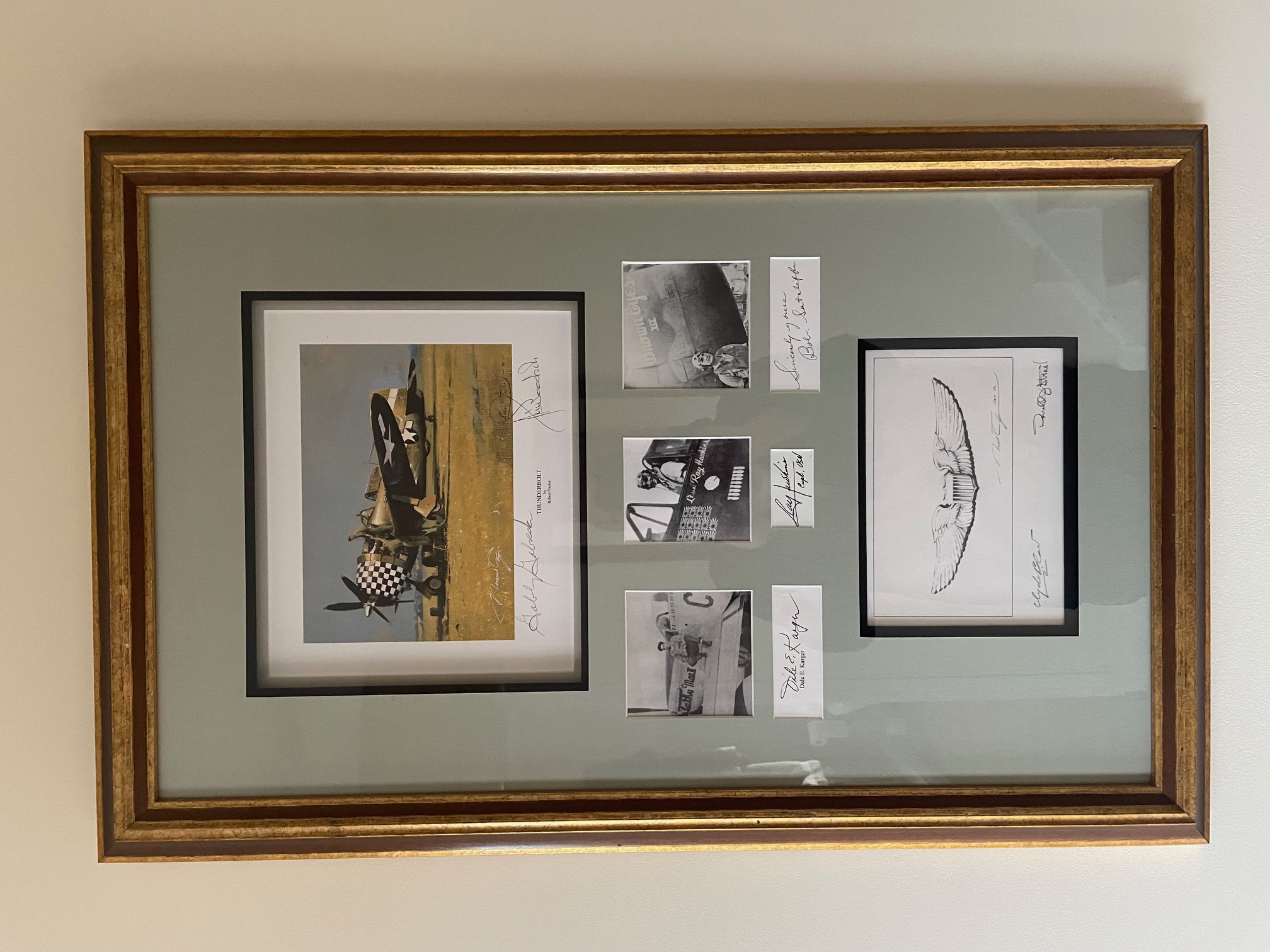 Thunderbolt by Robert Taylor signed by Colonel Gabby Gabreski and Lieutenant Colonel Jim Goodson...Matted in the mount are three further USAAF Fighter Aces who flew Thunderbolts and Mustangs : Captain Robert Chandler Sutcliffe , Captain Arthur Ray Hawkins and First Lieutenant Dale Ernest Karger...Also matted in the mounts at the bottom is an original Robert Taylor drawing of USAAF pilots wings , it is signed by two great American Thunderbolt Fighter Aces Captain Clyde B " Stonewall" East and Donald "Jersey Jerk" Jackson Strait...priced @ £895.00