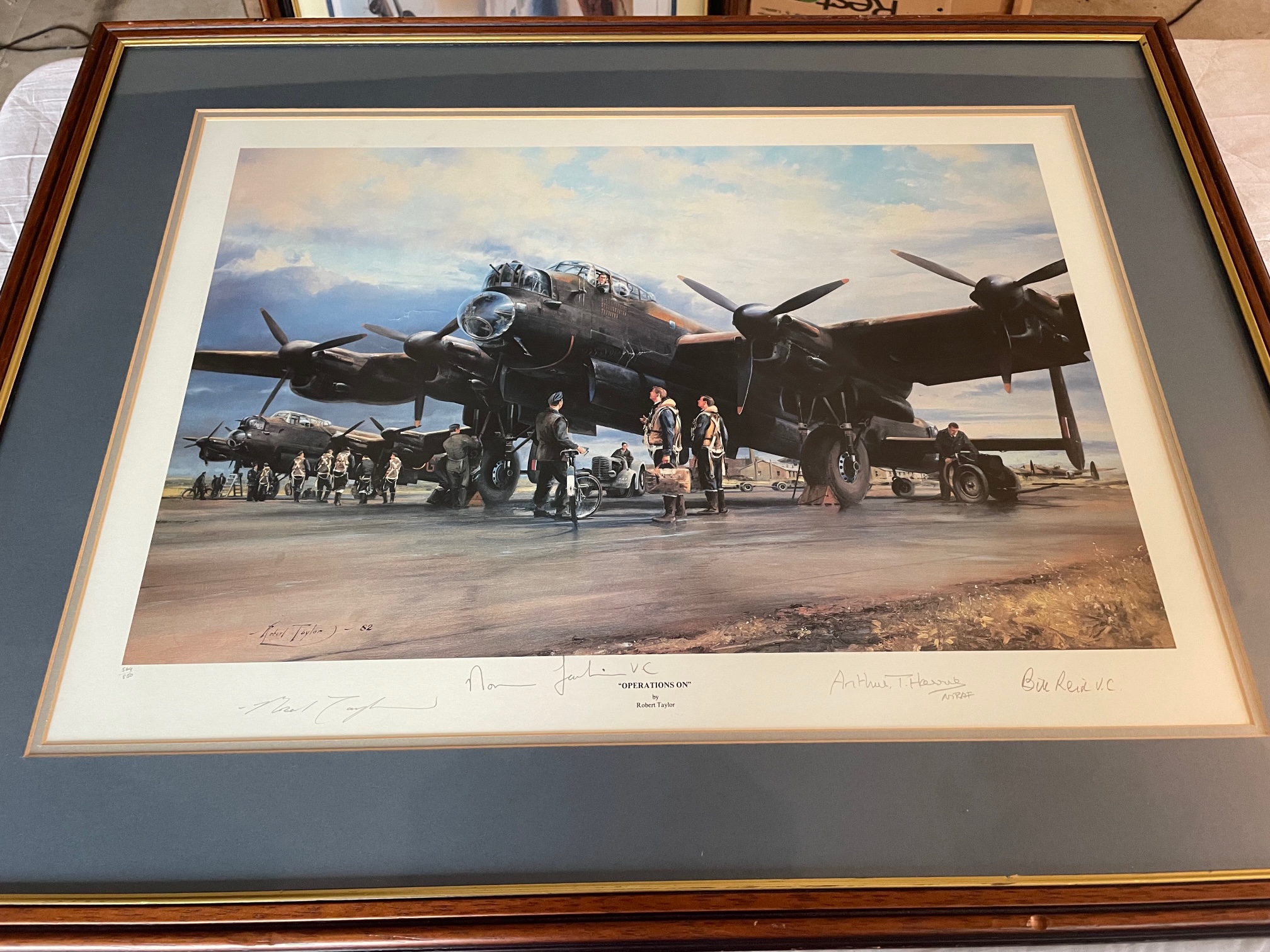 A classic Robert Taylor print depicting crews preparing Lancaster bombers for another long, perilous night-time mission over Germany...Each print has been signed by the artist Robert Taylor and also features the signature of Commander in Chief of Bomber Command 1942-1945, Marshall of the Royal Air Force Sir Arthur ' Bomber ' Harris...This particular print has also been additionally signed by Norman Jackson VC and Bill Read VC...priced @ £595.00 for this rare print framed to conservation standard.