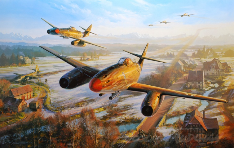 As the war in Europe drew to its close , an elite group of Luftwaffe fighter pilots , undaunted by the over-whelming odds against survival , heralded In the new jet age in a final desperate attempt to defend their homeland. All were veteran combat pilots , most having flown continually since the Battles of France and Britain almost six years earlier. Many had completed upwards of 1000 combat missions , and even as Germany was fast falling to the Allied advances , these remarkable men refused to contemplate defeat. Roaring off the airfields of southern Germany with a sound hitherto unheard, Willie Messerschmitts Me262 jet fighter was faster than anything that had flown before. Thrown into battle whilst still in development, the aircraft was a handful to fly effectively, but when it made its first bomber interceptions it bought immediate consternation to the Allied aircrews. In the hands of the most experienced fighter Aces the world has ever known, the Me262 was an instant success. In his dramatic painting Nicolas Trugian has recreated a typical scene from the final days of World War II , Me262's of JG7 race back to their base at Brandenburg after intercepting a USAAF bomber raid on Munich , and Luftwaffe bases in the area. With rockets expended and fuel running low , they hug the Bavarian landscape to avoid the attentions of the American escort fighters. Below them a B-26 , brought down on an earlier mission , has crash-landed in the fields still covered with a sprinkling of late winter snow. In the distance the afternoon sun glistens on the Bavarian Alpine mountains...Each print in Nicolas Trudgian's Limited Edition , Return Of The Hunters , is signed by 3 high-scoring Luftwaffe Aces and exponents of the Me262 , General Adolf Galland , Major Erich Rudorffer and Leutnant Fritz Tegtmeier...priced @ Sold ... To complement the purchase of your fine art print, we are now able to offer a professional Picture Framing service. For further details please contact us by phone or email.