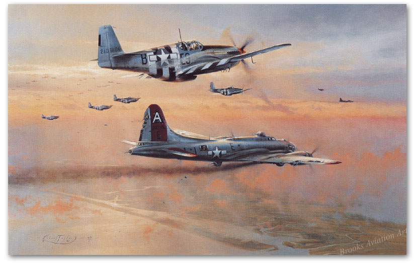 Badly marked by Focke-Wulf 190â??s the B-17 The Peacemaker of the 91st Bomb Group limps towards the sanctuary of the English coast escorted by P-51B Mustangs of the 361st Fighter Group. To keep her flying the crew are jettisoning everything that they can. The Peacemaker made it back to Bassingbourne that day , July 20 1944 ; eight others did not... Individually hand signed by : The artist Robert Taylor and Bud Anderson , James Fletcher , Marion Havelaar and Steve Pisanos...priced @ Sold... To complement the purchase of your fine art print, we are now able to offer a professional Picture Framing service. For further details please contact us by phone or email.