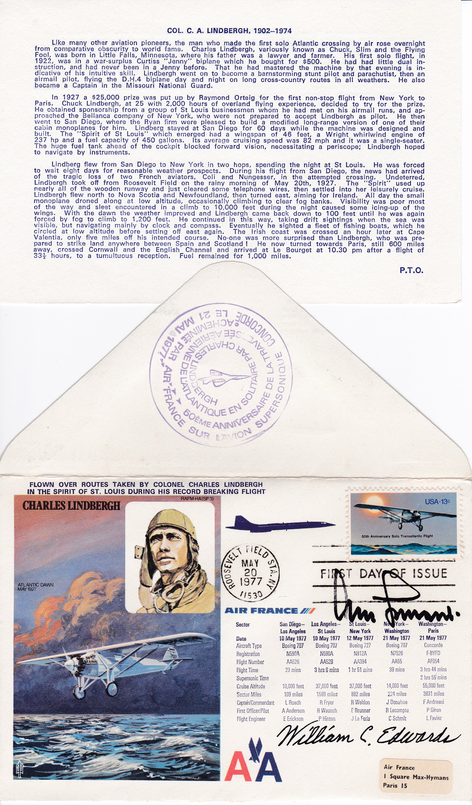 First Day of Issue / 1st Day Cover commemorating the 50th Anniversary of Colonel Charles Lindbergh Record Breaking Transatlantic Flight in the Spirit of St. Louis...5 flights were flown over the same routes taken by Lindbergh on his record breaking flight from the 10 may 1977 to 21 May 1977 in Air France Aircraft a Boeing 707 N590A a Boeing 727 N812A a Boeing 707 N7526 and lastly a Concord F-BYFD...It has been franked ' Roosevelt Field STA.NY May 20 1977 and has a 13 cent stamp 50th Anniversary Solo Transatlantic Flight...Comes complete with the information slip inside...This particular cover has just been purchased recently by ourselves from the Great Luftwaffe General Adolf Galland's widow Heidi Galland , it is not numbered and was a gift to the late General for signing the edition of this cover at the time , It is part of a large batch of covers that we have just purchased from the late Generals widow Heidi Galland...It is signed on the front by Luftwaffe Legend General Adolf Galland and William C. Edwards...priced @ £125.00 for this one off cover that once belonged to the Great General Adolf Galland.