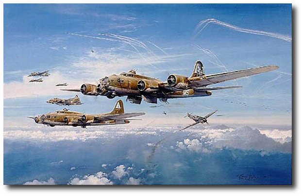 Very Rare secondary market print RETURN FROM SCHWEINFURT...This is a very rare print sold out many years ago and is well sought after on the secondary market...17 August 1943 , the day the B-17's of the ‘ Mighty Eighth ’ attacked Regensburg and Schweinfurt , one of the most dangerous raids of WWII. Here we see B-17 Fortresses of the American 8th Air Forces 1st Wing , fighting their way back from Schweinfurt on that fateful day...The title alone sums up the legendary status surrounding this outstanding image which depicts one of the most dangerous, and arduous, bombing missions in the history of air combat...Signed by the artist : Robert Taylor and four great wartime leaders and legendary airmen , Generalleutnant ADOLF GALLAND , General CURTIS LE MAY , Colonel ‘HUB’ ZEMKE and Air Vice-Marshal JOHNNIE JOHNSON...The Airman who signed this sought-after piece must surely make this one of the most sought after collectors items available...priced @ £1295.00...To complement the purchase of your fine art print, we are now able to offer a professional Picture Framing service. For further details please contact us by phone or email.